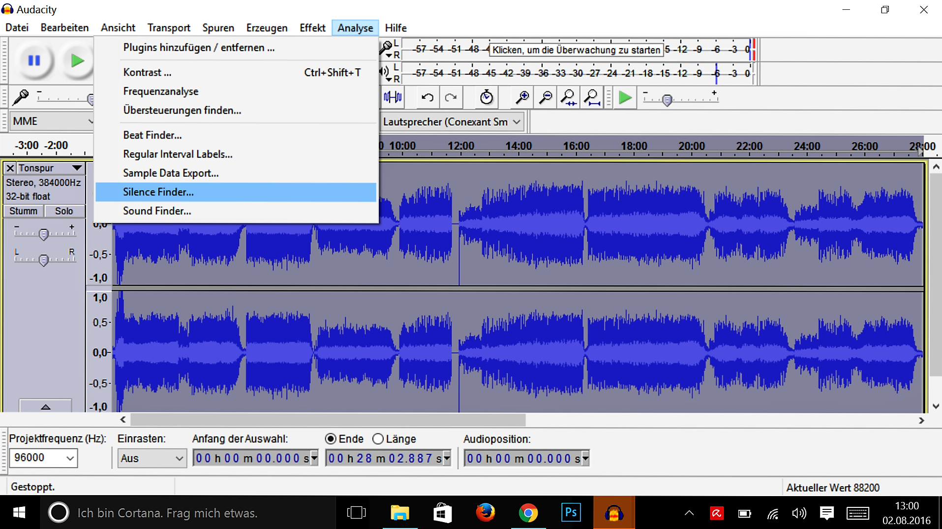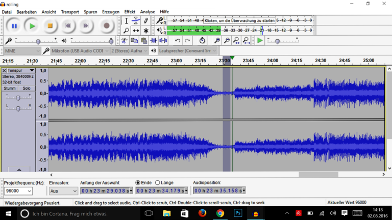 Der Audio-Editor muss das Rauschen bzw. die Störung, welche abgeschwächt werden soll erst “kennenlernen”. Hör dir die Aufnahme an und markiere einen Teil, wobei das Rauschen und Knistern besonders gut zu hören ist.